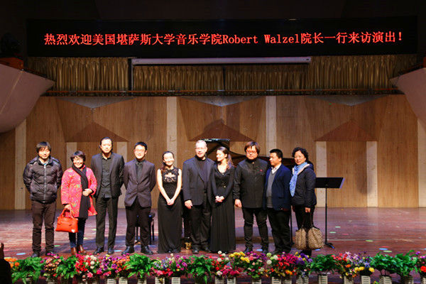 2016年2月24日晚19:30分,来自美国堪萨斯大学音乐学院的演奏家们在华中师范大学音乐厅里上演了一场别开盛宴的艺术家访问音乐会,出席本次音乐会的领导及嘉宾有华中师范大学音乐学院副院长王笑合、声乐系主任孙静梅、器乐系王凯平老师和钢琴系辛欣老师。美国堪萨斯大学音乐学院艺术团是由该校音乐学院师生组成的一个专业艺术团体,乐团的表演代表了堪萨斯州以及美国腹地的最高演奏水平。今晚的音乐会包含了各种经典曲目:从巴洛克时期大师巴赫的大提琴组曲到印象德彪西的意象集再到现代音乐家格什温的前奏曲等等。整个音乐会涵盖了鲜为人之的艺术珍宝和较为前沿的新作品。
