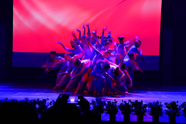 第一个节目在观众的欢呼声中开始了,2013级舞蹈生带来的的舞蹈《点亮中国》让观众们眼前一亮,他们手举着“火炬”,那坚定的眼神仿佛告诉大家:前进再前进!团结起来!才能点亮我们的国家!整个舞蹈大气磅礴的气势触动人的心灵,音乐厅中掌声不断。接下来由2014级舞蹈生带来富有少数民族气息的《呼唤绿茵》,她们身着绿色的带有亮片的服饰,轻快俏皮的表演使得整个舞台春意盎然,她们摇摆着手中的绿叶,如同带来了春天般的温暖。第四个节目是曾获得“湖北省大学生金奖”的《墨意荷韵》,十个男子身着黑色灰色交替的纱裙饰演“出淤泥而不染”的荷花,下雨时,他们被打散,低着头原地旋转着;天晴了,他们重新聚合在一起,仰着脸庞面向阳光,跳跃起舞。舞蹈飘逸清雅,怎不令人陶醉其中呢喃之美!观众的心情也随他们的动作上下起伏着,时而安静,时而洒脱。舞蹈谢幕,全场呐喊声欢呼声交织成一片。