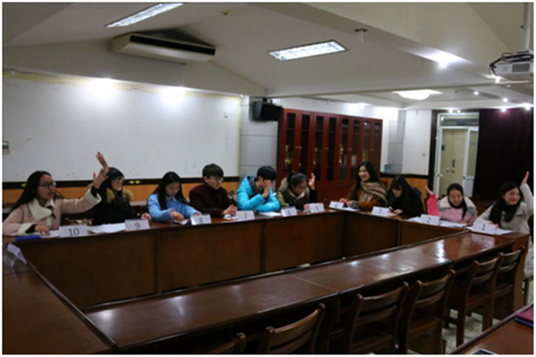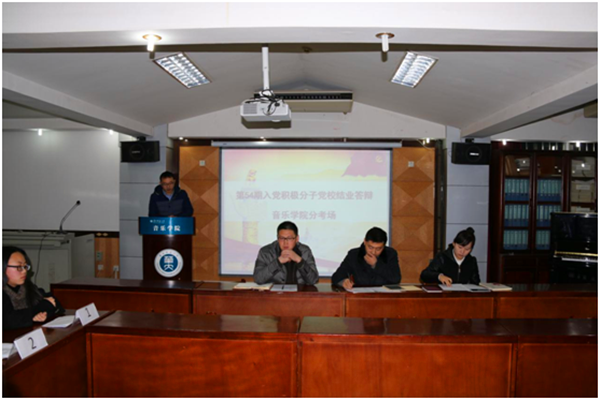 2015年12月19日晚18:30,华中师范大学音乐学院第五十四期入党积极分子党校结业答辩在音乐学院323会议室顺利召开。参加本次答辩的指导老师有音乐学院党委书记孙永祥、党委副书记叶雷、辅导员胡静思老师。本次答辩由辅导员老师吴文劼主持,参与本次答辩的还有第五十四期音乐学院入党积极分子。