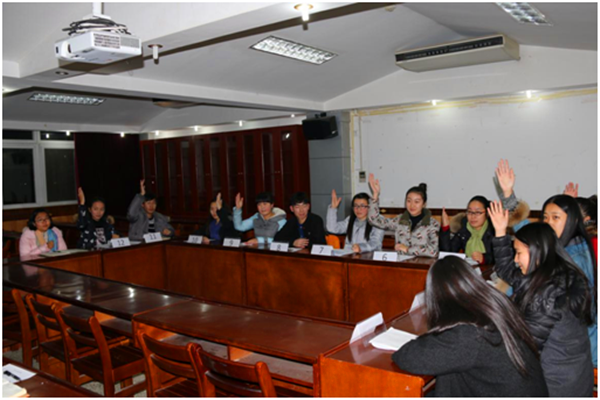 首先由第一小组答辩,组员们依次对“入党积极分子如何在班级建设中发挥作用”这个问题提出了自己的看法。第一组余婷认为作为一名积极分子要努力做到“三字”——首先是“带”字,树立起带动学习、引领思想、传递文明、管理班级的作用;其次是“树”字,“树”字为先,学习上当标兵,生活上做模范,在身心上健康、工作上是榜样;最后是“帮”字,积极帮助有困难的同学并切实做到为之解决问题。