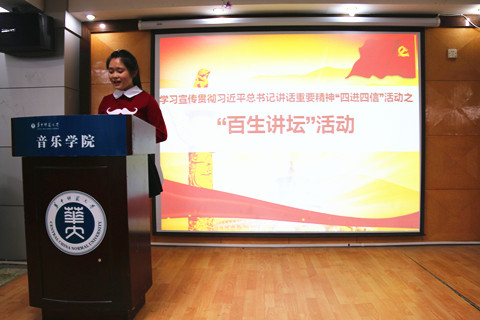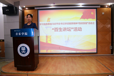 “百生讲坛”是由团省委为贯彻落实团中央《关于开展高校共青团学习宣传贯彻习近平总书记系列重要讲话精神“四进四信”活动的通知》,进一步深化湖北省高校共青团“四进四信”活动、学习宣传贯彻习近平总书记系列重要讲话精神,在全省高校共青团中组织开展的活动。音乐学院团委积极相应号召,开展“四信活动”,同学们通过找寻相关资讯、自我竞赛演讲,进一步牢固树立对党的科学理论的信仰、坚定走中国特色社会主义道路实现“中国梦”的信念、增强对党和政府的信任、增进对以习近平同志为总书记的党中央的信赖。