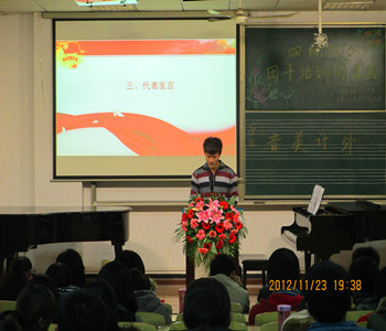 在大家热烈的掌声中,音乐学院党委副书记孙永祥老师上台致辞。孙书记一上台,便微笑着对大家说,“今天啊,我要向大家谈谈我的个人问题”,一句简短的话语,便使得会议气氛急速转热,顿时拉近了领导老师与参会同学间的距离。“我今天要向大家讲的,是我大学生活中参加学生工作的经历,我在这里说这些,并不是告诉大家我的优秀,而是希望大家明白,我的学生工作经历寄给于了我太多,让我的大学生涯比其他人更加充实”。孙永祥书记真诚的向四院12届的学生会成员们讲述了自己的大学生活经历,让所有人都认识到了学生工作者的职责与荣耀,“套用我学生曾对我说过的一句话,就是别人的大学读了4年,而我的大学生是读了8年的,学生工作经历让我比别人多读了一次大学!”