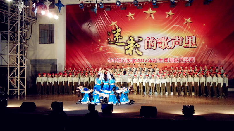 (通讯员梁思扬陈朝晖 摄影何雅婷)2012年9月22日晚7点,2012年新生军训歌咏比赛在华中师范大学电影场隆重举行。出席本次歌咏比赛的嘉宾有华中师范大学党委副书记谢守成、学工部部长刘宏达、校团委书记何金辉、军训团团长张斌及相关职能部门负责人、院系党委副书记等。