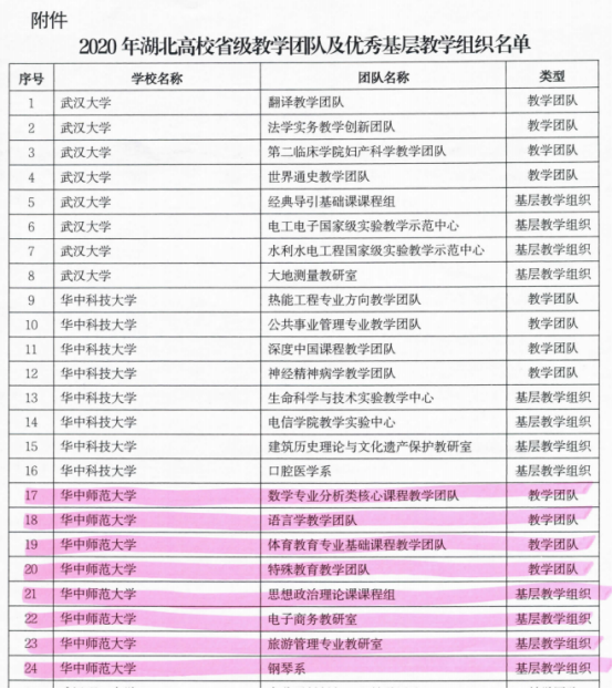 日前,湖北省教育厅发布了《省教育厅关于公布2020年湖北高校省级教学团队及优秀基层教学组织名单的通知》,我院钢琴系成功入选2020年湖北高校优秀基层教学组织。