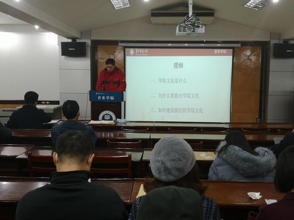 在当天的报告中,冯圣兵从学院文化是什么、为什么要提出学院文化建设问题、怎么进行学院文化建设三个方面展开,向全院教工简洁而深入地介绍了自己对于学院文化建设的认识和思考。他还展示了暑期音乐楼及音乐厅进行全面维修改造的计划和效果图,号召大家结合二级文明单位创建,为学院文化建设献计献策,齐心协力建设音院大家庭。院长康瑞军教授在总结讲话时深刻分析了学院文化建设现状,强调要破立并举,坚决反对以个人中心主义和专业至上主义为代表的不良文化,努力建设团结奋进、昂扬向上的学院主流文化,为推动学院事业健康快速发展提供良好的环境氛围和强大的精神支持。