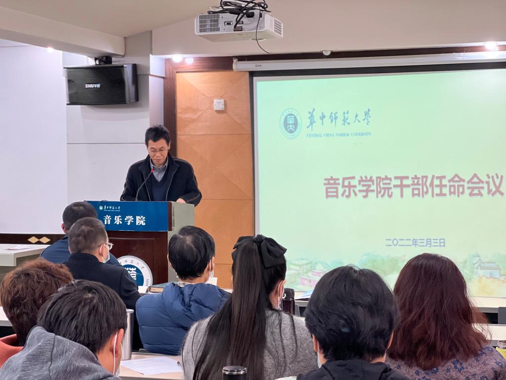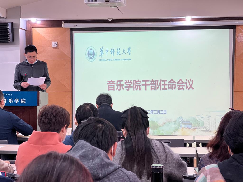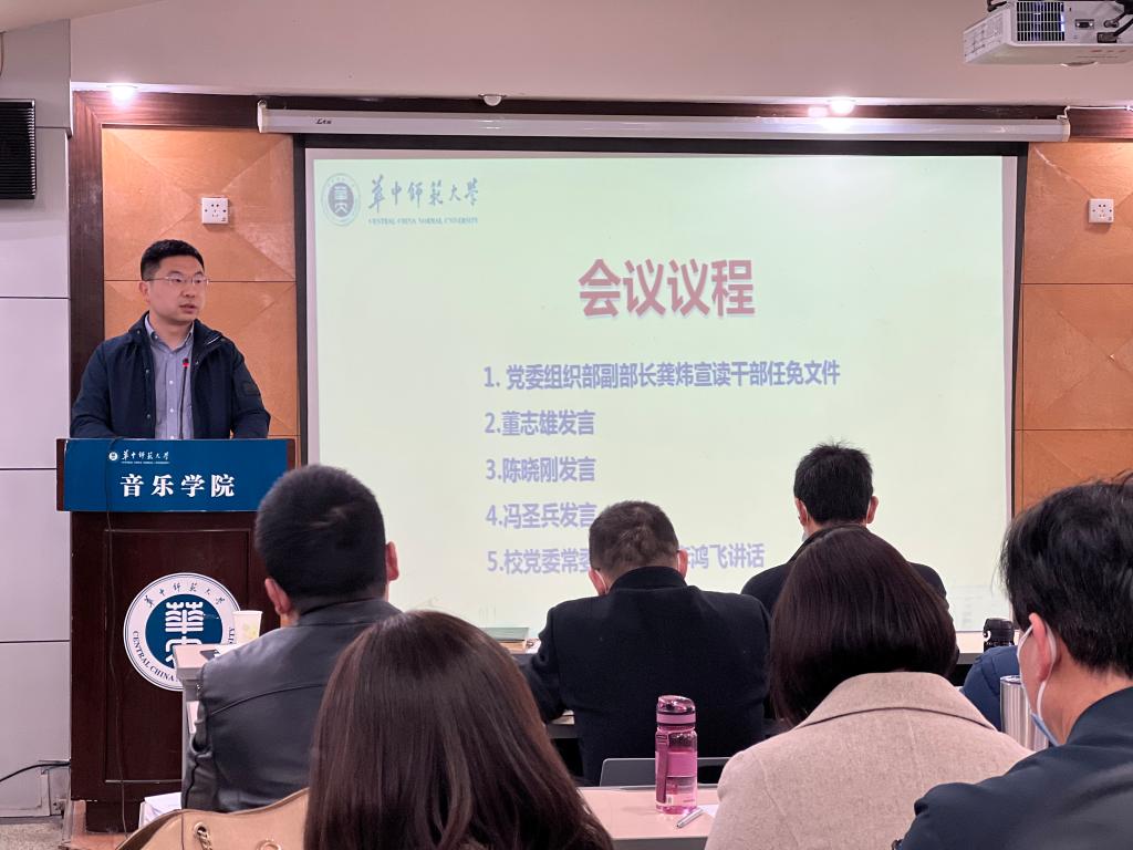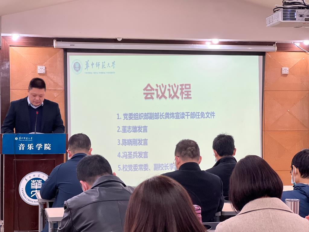 龚炜同志宣读了学校干部任免文件。学校党委研究决定,陈晓刚同志任音乐学院党委副书记,免去董志雄同志的音乐学院党委副书记职务。