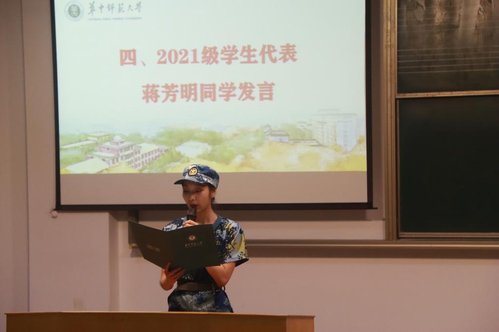 音乐学院2021级本科生蒋芳明代表音乐学院全体参训学员向领导、教师、教官做出保证,全体学员将以饱满的热情迎接军训,以更高的标准要求自己,以无畏的精神面对挑战,以昂扬姿态向军人致敬,以蓬勃的朝气向祖国致敬。