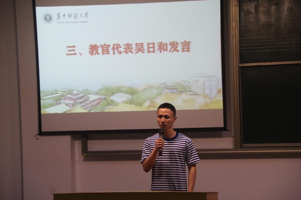 动员大会最后,音乐学院2021级辅导员郭金栋从“为什么要军训”这个问题出发,结合自己在华师参与和协助开展军训的经历,鼓励同学们直面挑战,磨砺自我,并向同学们强调军训期间的时间安排和各项管理制度,希望同学们在军训过程中严格遵守。