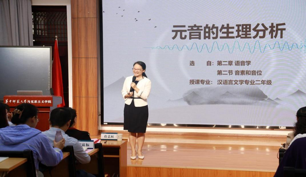 集体备课会第一阶段是青年教师教学展示。第一位上场的是文学院副教授陈蓓老师,她将课程《元音的生理分析》的内容分为三个部分进行讲说。先从元音的性质介绍切入,再从元音音色的影响因素来展开介绍。她指出元音音色是由声腔共振特性决定的,具体分为由舌位的前后、舌位的高低、发音时嘴唇的收圆或展平三种形式,通过展示系列口腔内壁发音时图片对比,直观展现了发音时人体机能的变化。最后对于元音语音特征的描写方式进行了详细介绍,将发音特征分为不等边四边形的表格归类,同时延伸到普通话中的元音、其它语言拍照用语这类能与生活中息息相关的现象联系起来的发音,通俗易懂,润物无声、引人入胜。最后陈老师举例了语言分析在生活中起到的社会功能作用与社会价值,运用“元音理论”,通过语言文字学“沉浸式”体验了课程思政的育人效果,给在场师生们留下了深刻印象。