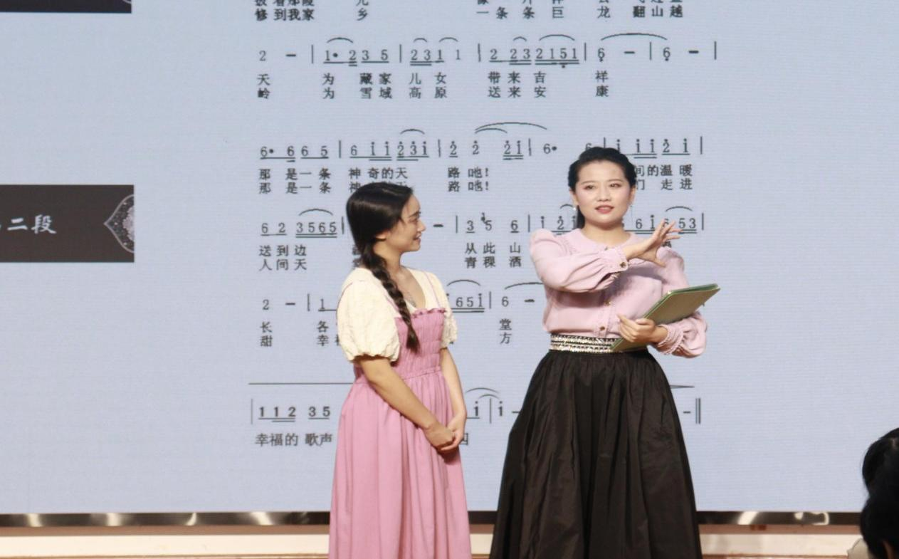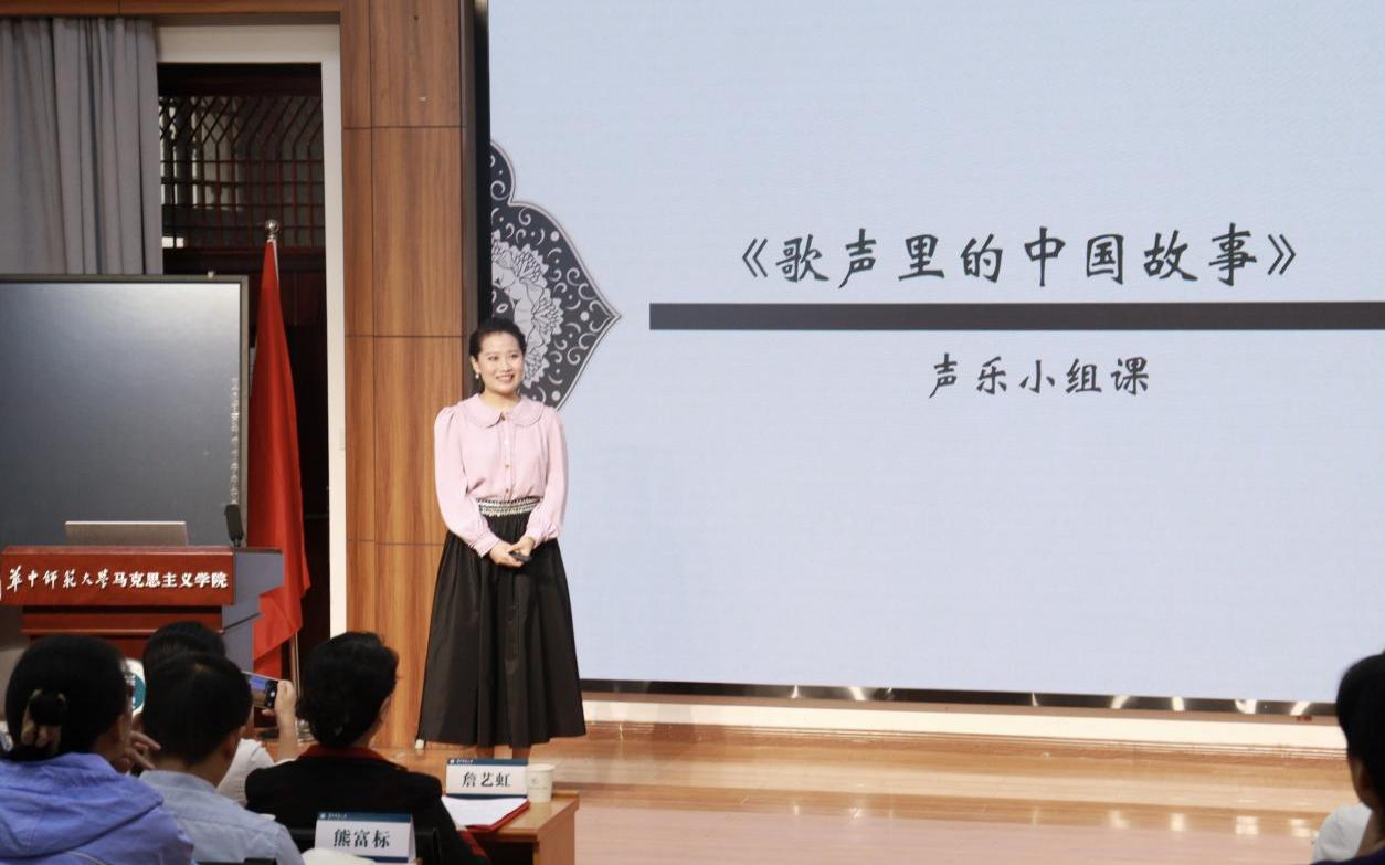 音乐学院教师万莉老师最后出场展示了课程《歌声里的中国故事——天路》。首先,万老师以回顾中国共产党百年历程的四个阶段切入,立足声乐专业教学携她的1名大一研究生、3名大一新生进行了拓展式教学作业的回课,学生们采取集体合作方式呈现了改革开放时期作品《爱的奉献》。随后启发学生思考情韵与声韵之间的关系,即不同情绪之间如何运用不同的音色表达,学生们都进行了积极的思考回答,并举例展示《天边有颗闪亮的星》、《万里春色满家园》两首作品中不同人物情绪在不同心境中的音色变化呈现。随后,万老师提问——作为当代大学生如何理解中国速度等问题,学生们也以武汉疫情、中国高铁的例子展现了在中国共产党正确领导下的强国姿态。随即,由导赏青藏铁路背景的方式引入主题教学歌曲《天路》,通过朗诵歌词与分段教唱歌曲的教学模式,及口传心授、循循善诱的教学方法,引导学生进行歌曲《天路》的不同情绪处理方式所呈现不同意境与效果的对比,最后以学生演绎歌曲完成授课。万老师所呈现的声乐教学特色鲜明,课堂运用多种学形式、方法与手段,全方位渗透思政教育理念,引发在场师生的热烈反响,赢得阵阵掌声,达成音乐教学培根铸魂,启智润心的效果。