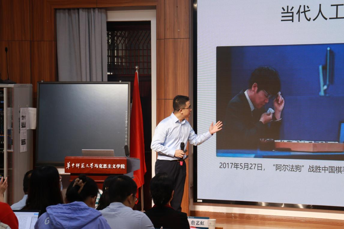 第二位展示的是马克思主义学院副教授陈吉胜老师。他将《人工智能可以超越人类意识吗?》分为两个部分进行讲述。首先对于人工智能的实质进行了阐述,指出人工智能的实质是人类智能的物化和人类意识器官功能的延伸。在第二部分人类意识与人工智能中,陈老师举例了图灵测试与中文屋思想实验两个例子,指出人的意识是知情意的合一,同时把人工智能划分为强人工智能与弱人工智能,并介绍了人工智能的符号主义路径、联结主义路径与行为主义路径。最后,总结了人工智能不能超越人类智能。陈老师的讲课循循善诱,条理清晰,层层追问,丝丝入扣,发人深省,结论自成,给在场师生留下许多思绪与收获。