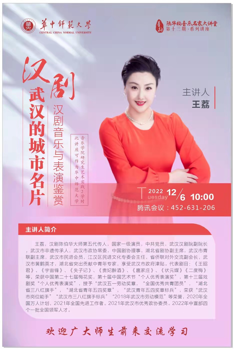 王荔,汉剧陈伯华大师第五代传人,国家一级演员,中共党员,武汉汉剧院副院长,武汉市非遗传承人,武汉市政协常委,中国剧协理事,湖北省剧协副主席,武汉市青联副主席,武汉市民进会员,江汉区民进文化专委会主任,省侨联对外交流副会长,武汉市黄鹤英才,湖北省突出贡献中青年专家,享受武汉市政府津贴。代表剧目:《王昭君》、《宇宙锋》、《失子记》、《贵妃醉酒》、《扈家庄》、《状元媒》《二度梅》等,荣获中国第二十七届梅花奖,第十届中国艺术节“个人优秀表演奖”,第十三届戏剧奖“个人优秀表演奖”,授予“武汉五一劳动奖章,“全国优秀共青团员”,“湖北省三八红旗手”,“湖北省青年五四奖章”,“武汉青年五四奖章标兵”,荣获“武汉市岗位能手”“武汉市三八红旗手标兵”“2018年武汉市劳动模范”等荣誉,2020年全国万人计划,2021年全国先进工作者。2021年武汉市优秀政协委员。2022年中宣部四个一批全国领军人才。