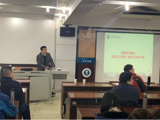 12月20日,音乐学院师德师风建设专题学习活动在323教室召开。学校人事部、党委教师工作部副部长李华忠为全院教职工作专题报告,会议由院党委书记冯圣兵主持。