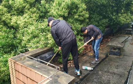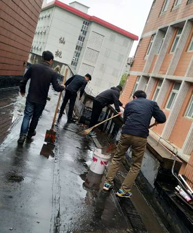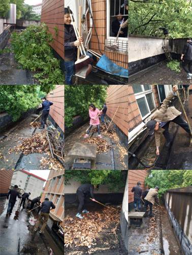 上午九点半,三支部全体党员同志在6楼集合,支部书记熊老师对活动进行了人员分工安排,并嘱咐大家注意自身安全。随后同志们便积极开始清理工作。天下起了小雨,气温较低,但大家克服困难,不怕脏不怕累,全体同志齐心协力,清理楼顶的树叶、杂物及淤泥,并将排水管道疏通。