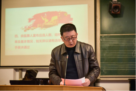 监票人闫大卫同志报告选票统计结果。经统计,收回有效选票101张,共有六位候选人选票超过总选票的一半。根据《选举办法》,主持人宣布冯圣兵、康瑞军、王笑合、吴凡、熊少凯等五位同志当选为华中师范大学音乐学院校第十二次党代会代表,须经学校党委批准以后正式生效。