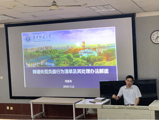 最后,冯圣兵书记带领全体教职工学习了《华中师范大学教师师德失范行为负面清单及处理办法(试行)》。他指出,办法适用于我校全体教职工和在我校从事教育教学和科研工作的兼职教师、访问学者、进修教师及在站博士后等,明确了师德失范情形和认定处理程序,全体教师要认真对照检查,扬长避短,坚守教师道德底线,把教书育人和自我修养结合起来,做优良师德师风的弘扬者和建设者。