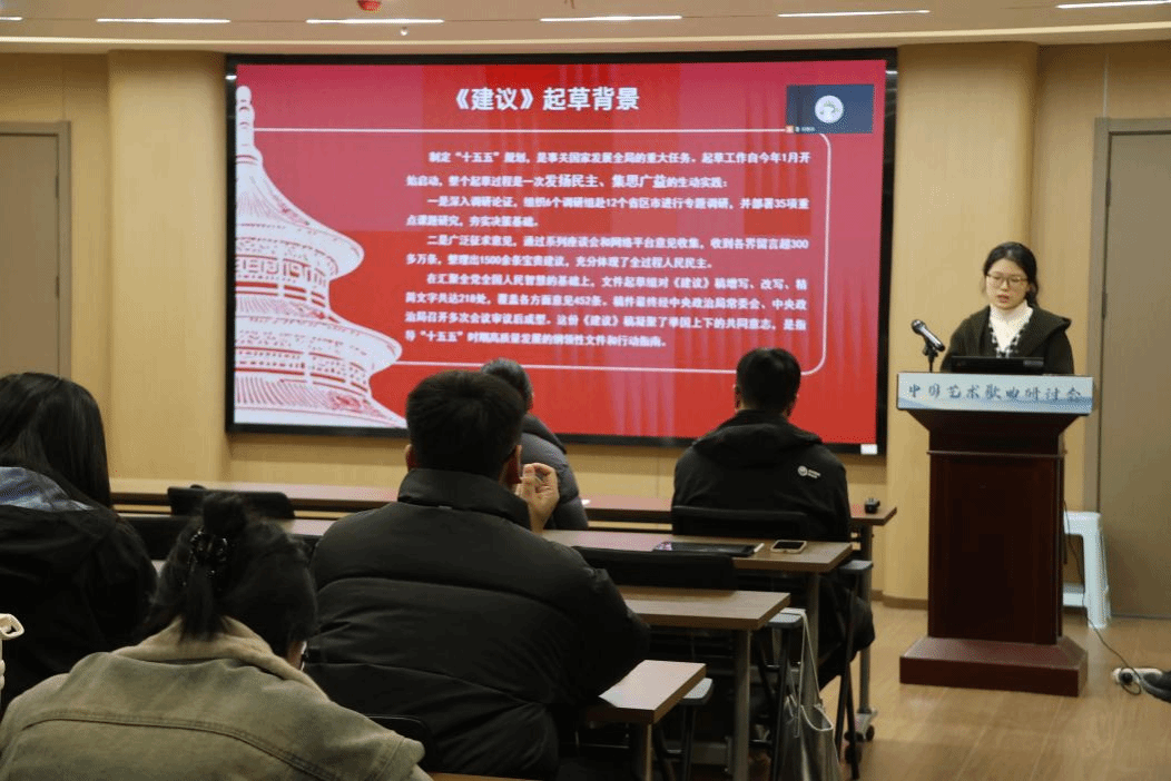 第一党小组胡可同志带领全体党员学习了《中共中央关于制定国民经济和社会发展第十五个五年规划的建议》的主要内容,并重点就“青年发展与国家规划”展开交流。她倡议大家将个人学业规划、职业发展与国家文化事业需求相结合,在艺术创作、学术研究中找准方向,以实际行动服务社会、服务人民。