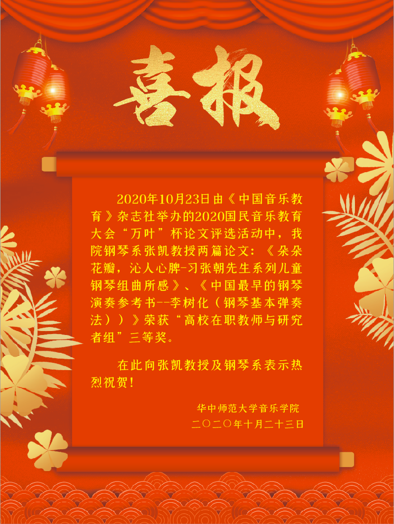 2020年10月23日由《中国音乐教育》杂志社举办的2020国民音乐教育大会“万叶”杯论文评选活动中,我院钢琴系张凯教授两篇论文:《朵朵花瓣,沁人心脾-习张朝先生系列儿童钢琴组曲所感》、《中国最早的钢琴演奏参考书-李树化(钢琴基本弹奏法))》荣获“高校在职教师与研究者组”三等奖。