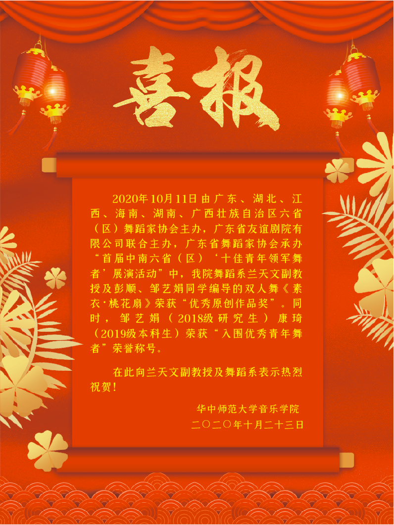 2020年10月11日由广东、湖北、江西、海南、湖南、广西壮族自治区六省(区)舞蹈家协会主办,广东省友谊剧院有限公司联合主办,广东省舞蹈家协会承办“首届中南六省(区)‘十佳青年领军舞者’展演活动”中,我院舞蹈系兰天文副教授及彭顺、邹艺娟同学编创的双人舞《素衣·桃花扇》荣获“优秀原创作品奖”。同时,邹艺娟(2018级研究生)康琦(2019级本科生)荣获“入围优秀青年舞者”荣誉称号。