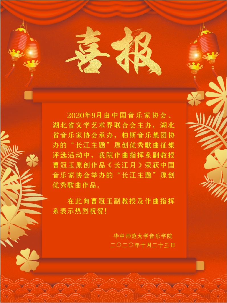 2020年9月由中国音乐家协会、湖北省文学艺术界联合会主办,湖北省音乐家协会承办,柏斯音乐集团协办的“长江主题”原创优秀歌曲征集评选活动中,我院作曲指挥系副教授曹冠玉原创作品《长江月》荣获中国音乐家协会举办的“长江主题”原创优秀歌曲作品。
