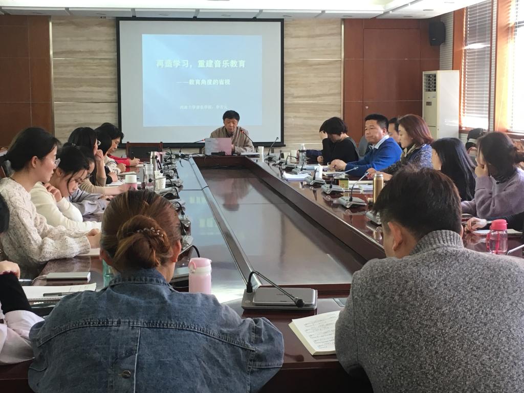 2019年4月1日14:30,陆华柏音乐名家大讲堂第六期•李方元教授系列讲座之二《再造学习,重建音乐教育——教育角度的审视》在科学会堂301会议室开展,此次讲座持续长达3小时。参加此次讲座的有我院音乐学系、钢琴系、声乐系、舞蹈系多位老师、我校教育学院老师以及我院研究生、本科生。讲座由康瑞军副院长主持。