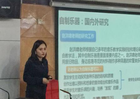 第三位发言的是中国音乐学院2017级硕士研究生蔡抒洗,题目为《自制乐器在偏远农村落后地区音乐教育的应用——一种基于自然主义教育思想的教学尝试》,以自然主义教育思想为指导思想,结合我国贫困地区中小学音乐教育在物质条件和师资力量等方面的落后现实状况。在农村贫困地区音乐教育中研究自制乐器进入课堂的必备性与有效性,并拟通过适当的教学实验,探究最优的教学方法。