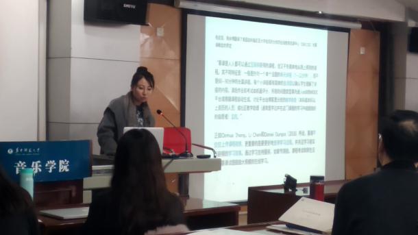 下半场第一位发言人是华中师范大学2016级硕士研究生徐爽,题目为《自在式衍展与自为式传承——崇阳提琴戏戏剧节评析》,该文以流传于鄂东南地区的提琴戏为切入点。提琴戏的主要伴奏乐器大筒胡琴在当地被称为“提琴”,深受当地人民喜爱。通过研究崇阳县政府于1992年开办的第一届重阳提琴戏剧节,直至2017年一共举办十届,对比戏剧节上使用的声腔板式,梳理提琴戏音乐的传承、流变情况。