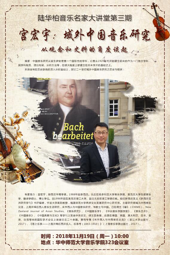 (综述:谭莹 图片:谭莹)2018年11月19日上午十点,《域外中国音乐研究———从观念和史料的角度谈起》专题讲座在华中师范大学音乐学院323会议室顺利举行。本次讲座的主讲人为新西兰华裔学者宫宏宇教授。宫老师于1988年赴新西兰,先后在维多利亚大学音乐学院、奥克兰大学攻读音乐学、翻译学硕士、博士学位。自1996年起在奥克兰理工大学、国立尤尼坦理工学院任教。现任新西兰英文《新西兰亚洲研究学刊》书评编辑、宁波大学兼职教授、福建师范大学两岸文化发展研究中心研究员等职。主要研究领域为中西音乐交流、上海开埠后西人音乐生活研究、来华西人与中国音乐研究、传教士与中国等。