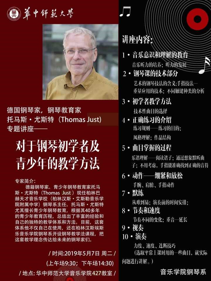 德国钢琴家、钢琴教育家、托马斯·尤思特专题讲座于2019年5月7日上午9点30分在华中师范大学音乐学院427教室开始,本讲座主题为:对于钢琴初学者及青少年的教学方法。参与本次讲座的人员有本校及外校的老师,和来自武汉音乐学院,汉口学院,黄石理工学院等学生。