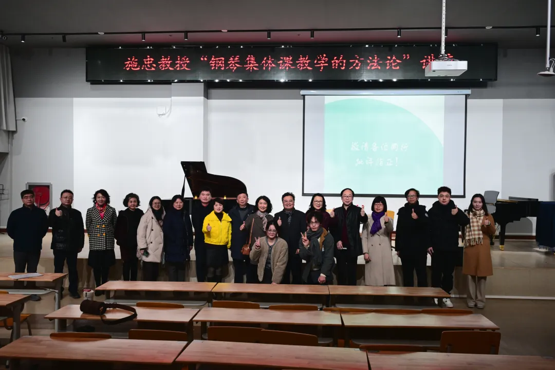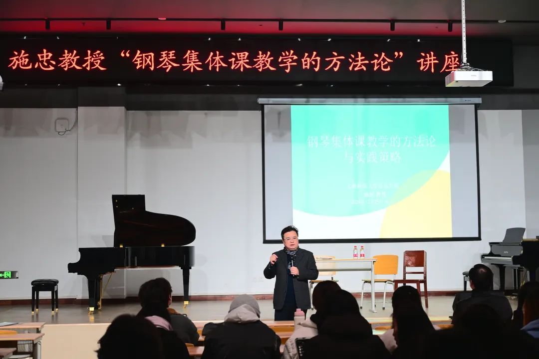 12月25日,由上海师范大学音乐学院院长施忠教授主讲的题为《钢琴集体课教学的方法论与实践策略》的讲座,在音乐学院727教室举办。我院全体钢琴教师参与教研交流,学院及兄弟院校师生参与聆听。