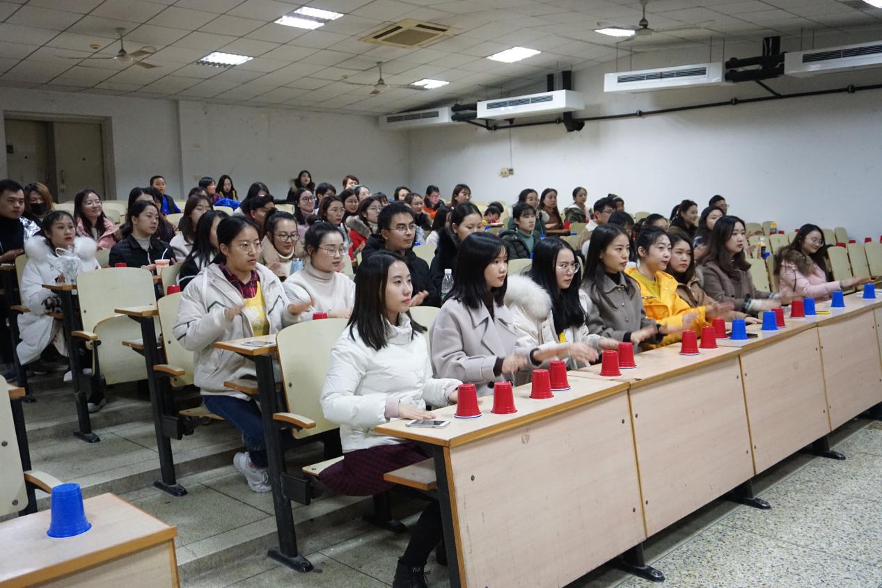 本次讲座共分为两个部分进行。第一部分中,刘畅老师以“手指游戏”、“记忆节奏游戏”、“民谣游戏”等音乐游戏使在场师生都充分感受到了音乐对我们的身体协调能力、记忆力等都有极大的影响。其中“记忆节奏游戏”中,以不同类型的身体打击节奏配合着动感的音乐,使大家在享受音乐所带来的趣味性的同时,不知不觉中锻炼了自己的节奏感以及记忆力。