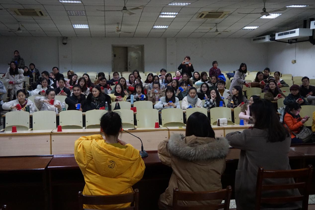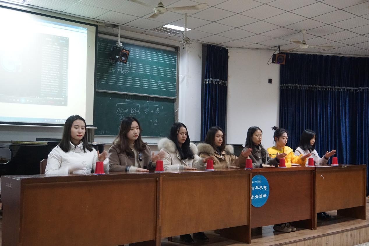 第二部分,由刘畅老师的七位研究生马璐瑶、张思妤、蔡铱晴、戴心、王钊、韩雪儿、刘莎为大家带来了精彩的杯子表演。随后,由2017级音乐教育方向研究生张思妤、戴心、韩雪儿对表演中的典型节奏型进行详细讲解,在场听众都积极参与并纷纷拿起手边的杯子进行练习。