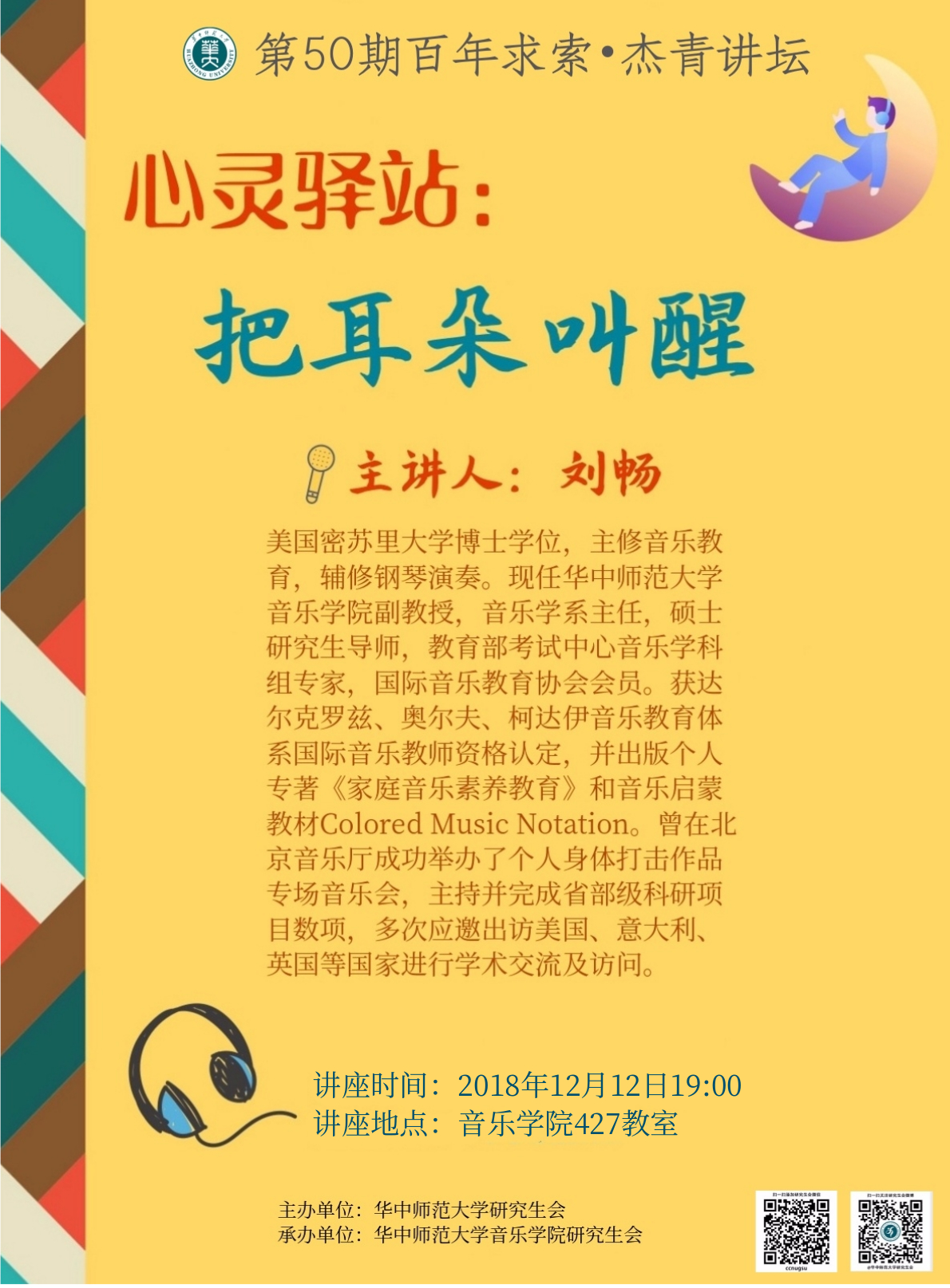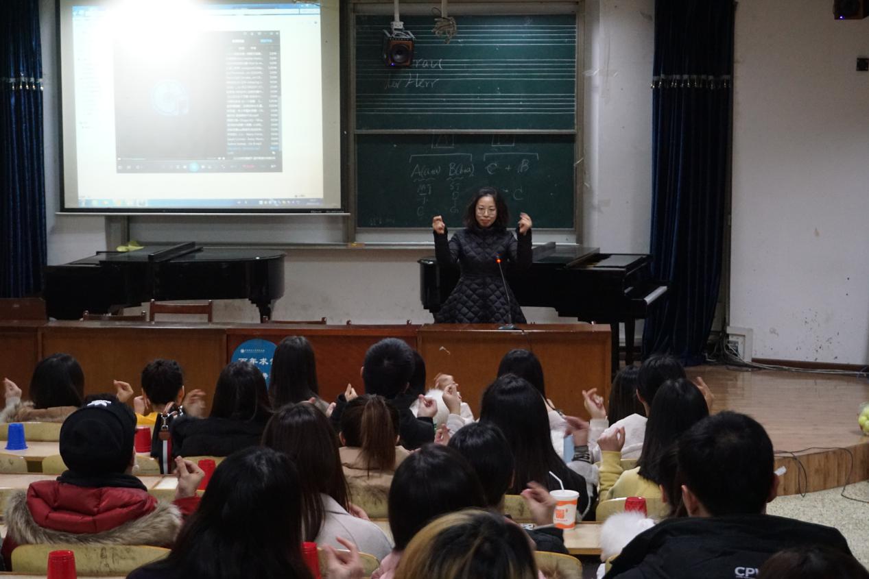 (综述:张思妤;摄影:吴佳萱)2018年12月12日(周三)晚上19:00,由华中师范大学研究生会主办,音乐学院研究生会承办的第50期“百年求索·杰青讲坛”在我校音乐学院427教室举行。本次活动主讲人为音乐学院音乐教育系主任刘畅老师,其以“心灵驿站:把耳朵叫醒”为题给我们带来了一场别开生面的讲座。本场讲座涵盖了达尔克罗兹、奥尔夫、柯达伊世界三大音乐教学体系。创造性地通过身体打击与肢体语言完美融合,充分将声势律动、身体打击等元素切实融入到生活之中。