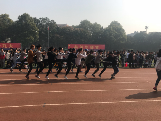 发令枪响,比赛正式开始。音院运动员组成的“小火车”被安排在第二赛道上他们喊着整齐的口号,拼劲全力地向前跳跃,阳光照在运动员的脸庞上,晶莹的汗水反射出青春的光彩。运动员们跳出的每一步,在保持平衡的同时还要避免踩到队员的脚因此他们聚精会神,不敢有丝毫的放松。一同参赛的三支队伍实力悬殊并不大,大家都在稳中求进,赛场上的竞争十分激烈。
