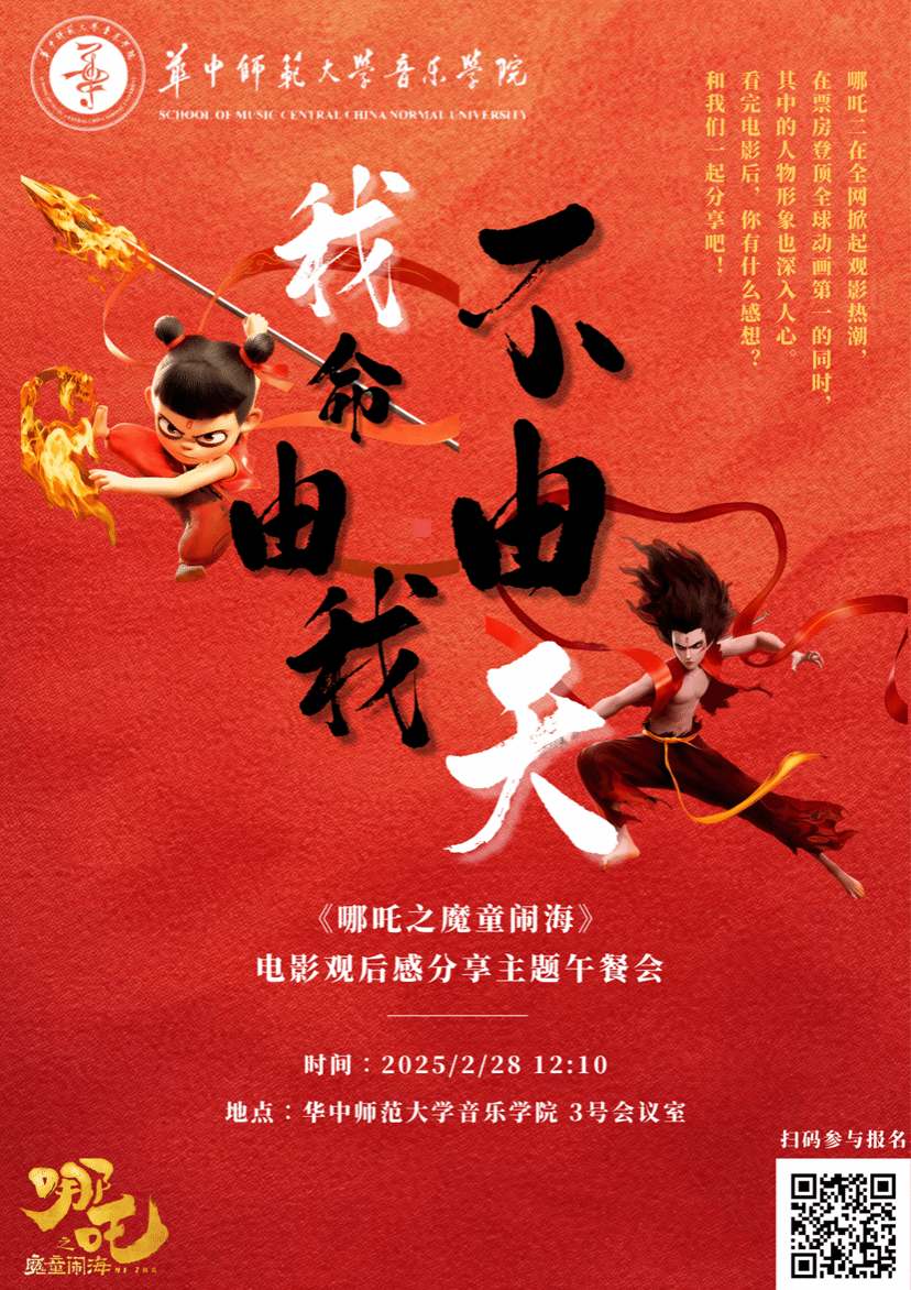 2月28日中午,《哪吒之魔童闹海》电影分享会在音乐学院3号报告厅成功举办。本次活动旨在通过观影后的交流与分享,进一步激发同学们的思考,增进师生之间的沟通与理解,同享观影时所感到的深刻共鸣。吸引了许多电影爱好者齐聚一堂,共同探讨国漫发展、文化传承、艺术创新、自身成长等丰富话题。2022级本科生辅导员陈龚泽祖、2024级本科生辅导员严楚弘莅临此次分享会,分享会由团委副书记桂思琪主持。