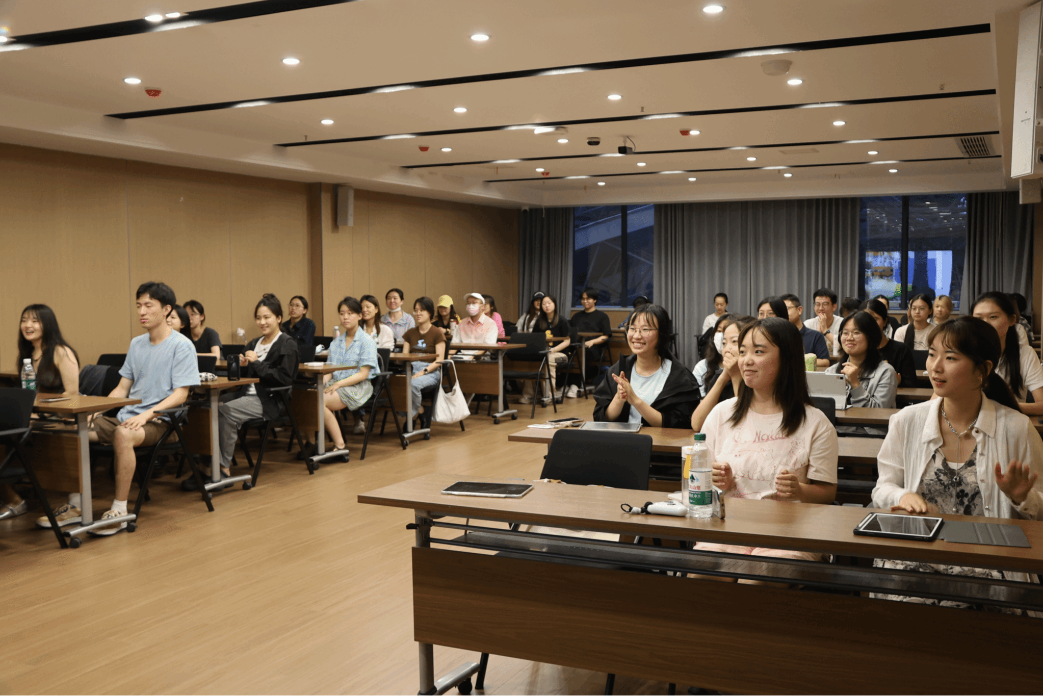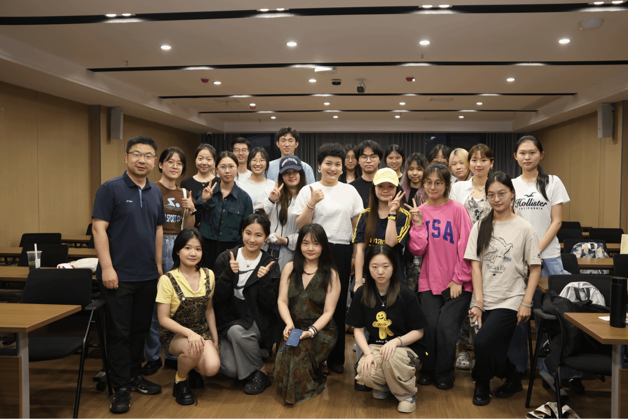 讲座尾声,王祎非带领学生参与“节奏协作”与“即兴歌唱”体验:通过分组跺脚、拍腿、拍手形成节奏轮唱,再以“哆来咪发唆”音阶即兴创作。“忘掉唱名,让声音自由流动,这就是音乐治疗的核心——用即兴打破常规,在协作中建立连接。”学生们在轻松氛围中感受着音乐对专注力、情绪与团队感的激活。