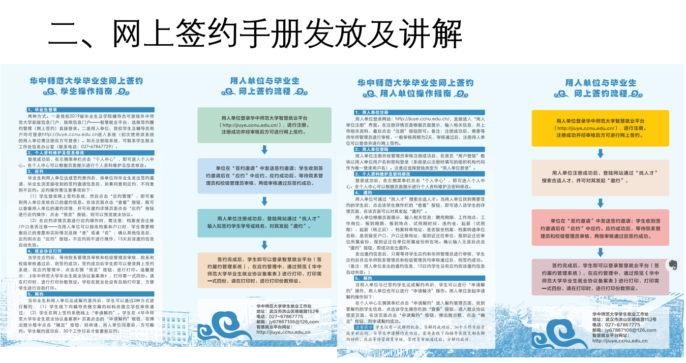 会议内容包括以下:1、发放并讲解《华中师范大学毕业生网上签约指南》,吴老师向到场的每位同学发放了《华中师范大学毕业生网上签约指南》,并对指南做了详细的讲解,同时在系统中进行了示范操作,让同学们对网上签约系统有了详细的了解。