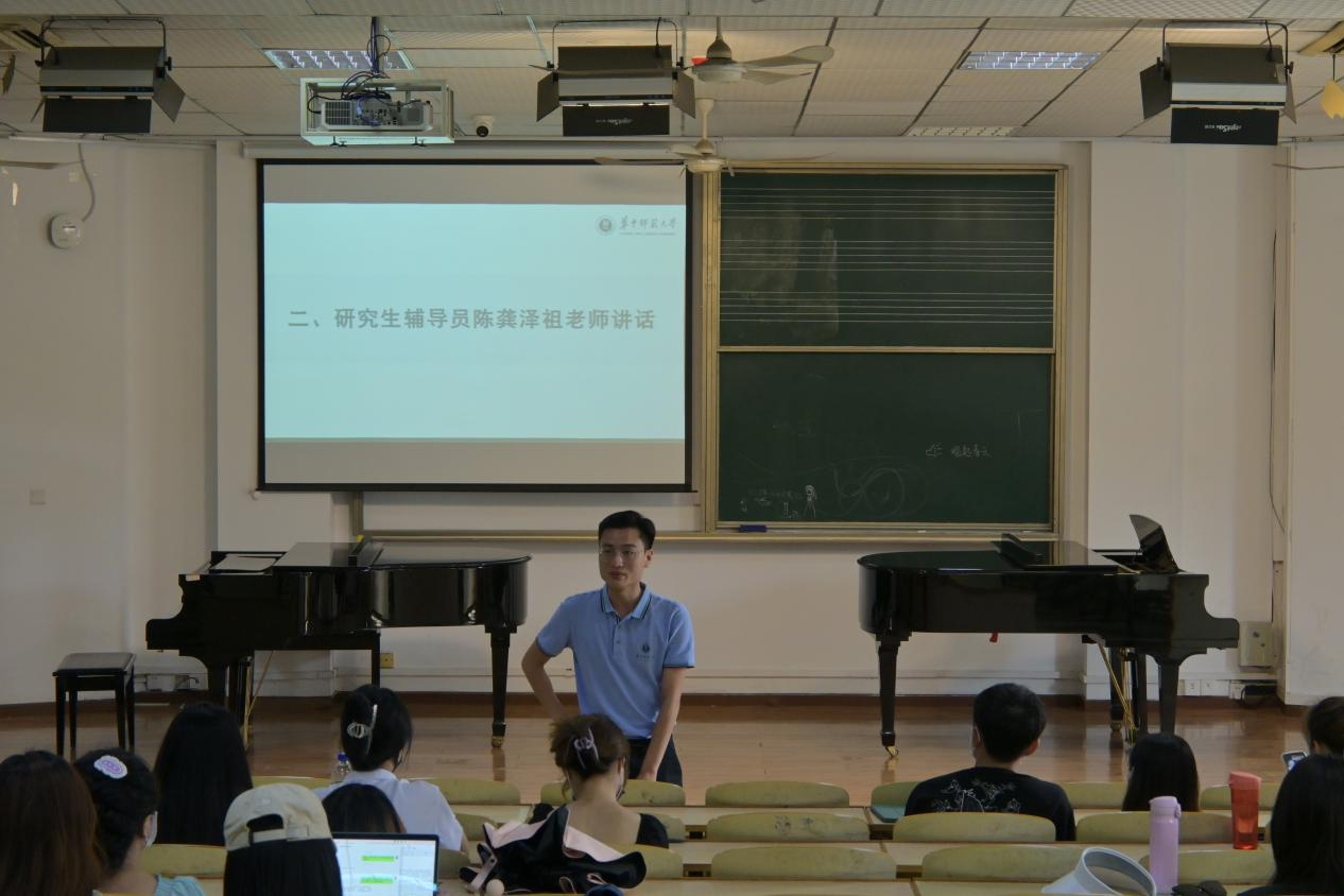 大会第二项:研究生辅导员陈龚泽祖讲话,初到音乐学院,陈老师在进行简短的自我介绍后,希望在今后的日子里可以全心全意为同学们服务,和同学们、老师们融洽相处。