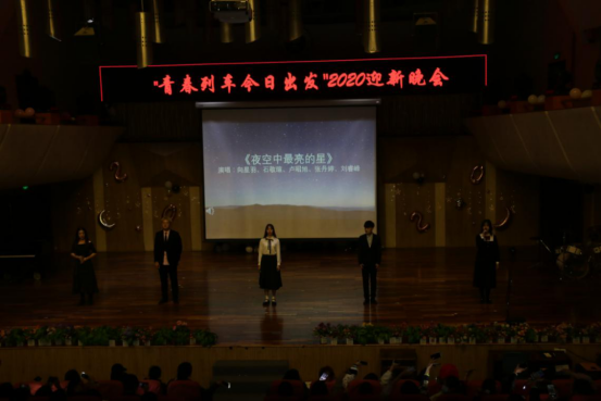 歌曲演唱《夜空中最亮的星》,台下的观众们纷纷举起手机,打开闪关灯,为台上演出的学长学姐们应援,一同合唱这首耳熟能详的歌曲!