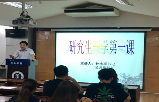 首先,音乐学院党委书记孙永祥代表学院向全体新同学表示热烈的欢迎,并从软、硬件资源、校园环境等方面介绍了学校及学院。孙书记给各位新生提出了两点建议。一是建议新生在研究生阶段不断开拓视野,做一个成功的人;二是建议每个人落实一个具体的规划,拥有一个明确的专业方向、一份漂亮的成绩单、一套专业水准的评价评定材料、一个职业化的外形和一份执着追求的恒心。
