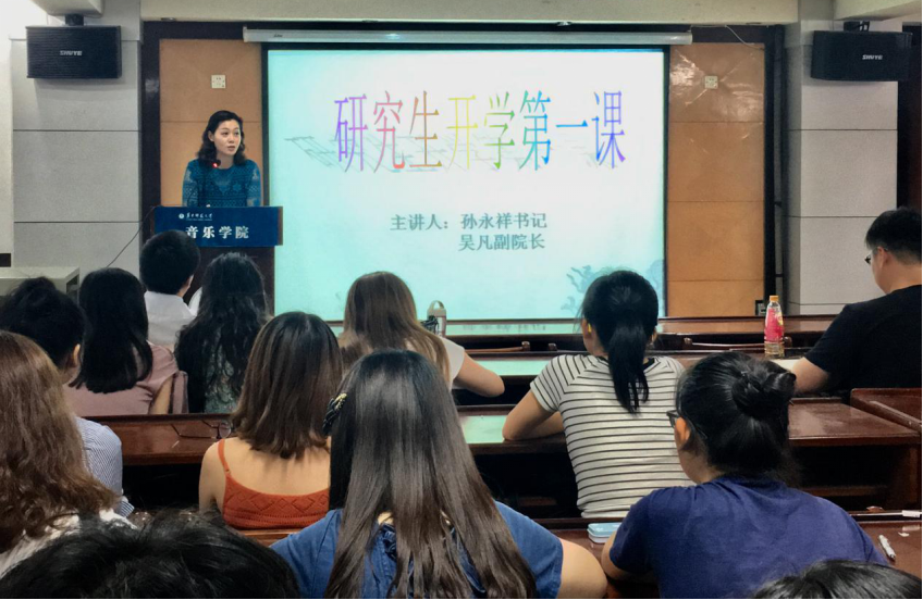 随后,音乐学院副院长吴凡欢迎新生们来到美丽的桂子山,祝贺他们开启了生活的新篇章。她提出了三个问题,引发新生思考。一是“你了解音乐学院吗?”;二是“你了解自己的专业方向吗?”;三是“你了解研究生吗?”她说道,研究生不应停留在浅层学习阶段,而是需要更深入的钻研、更投入的创新。