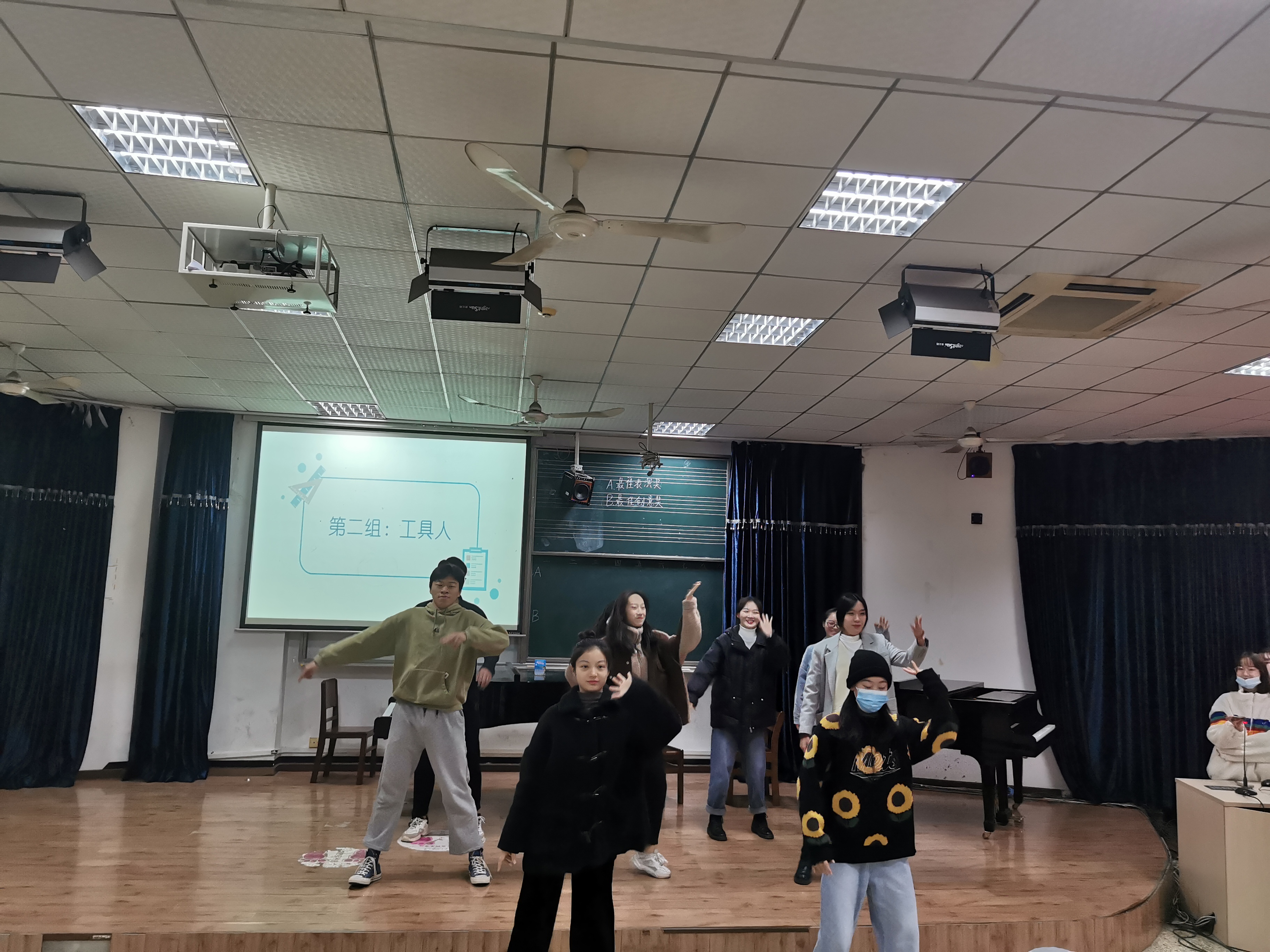 本次结业仪式共有九个小组进行抽签表演。首先出场的是第二组,他们的主题是“工具人”。开场小组成员站成一排用机器人定格动作契合主题,随后散开自编舞蹈。最后下台与观众进行互动,把一种欢乐的气氛带给大家。