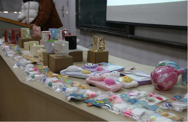 班委悉心准备了杯子、发夹、洗脸发带、糖果等丰富精美的礼品,供同学们以抽奖的方式领取。