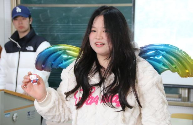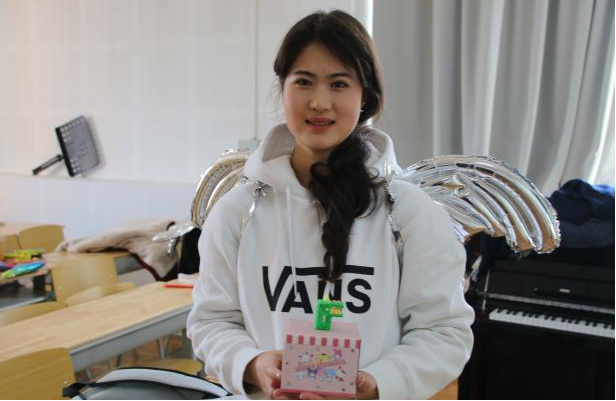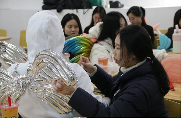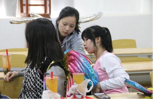 活动开始前,班委给同学们发放蝴蝶翅膀和奶茶,同学们互相给对方带上蝴蝶翅膀,温暖有爱的举动表达了关爱,增进了友谊。