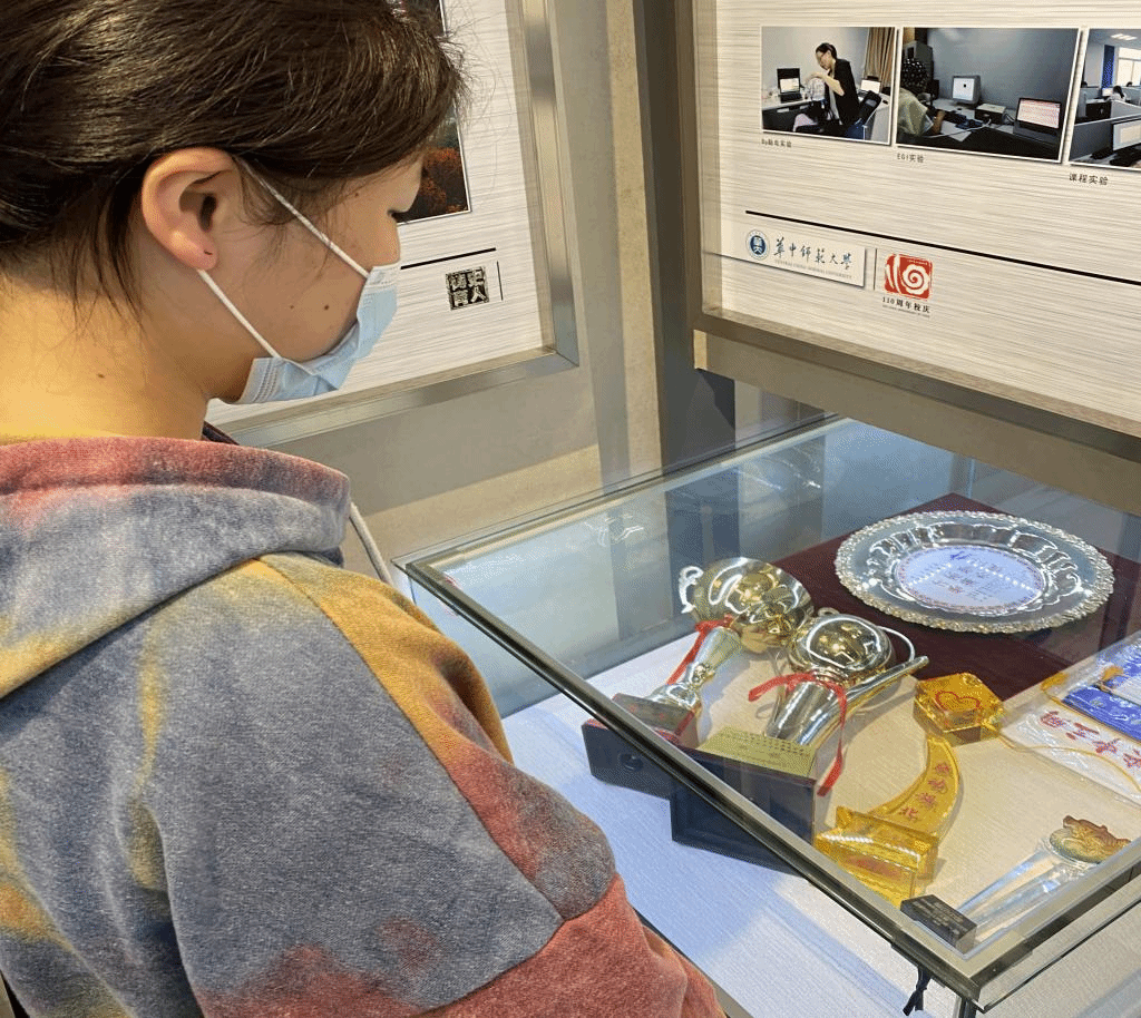 在校史馆接待人员的带领下同学们沿着历史长廊,深入地了解了华中师范大学近百年的历史。展厅分为三个主题:印象华师、百年辉煌和十年跨越,讲解员仔细地梳理了华中师范大学曲折前行的历史脉络,大家时而聚集在讲解员身边聆听讲解,时而分散开仔细了解自己感兴趣的史料。