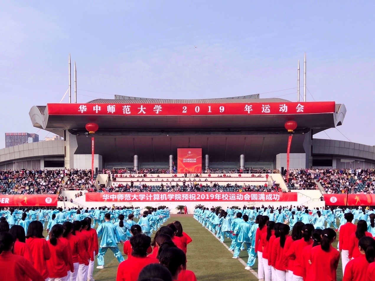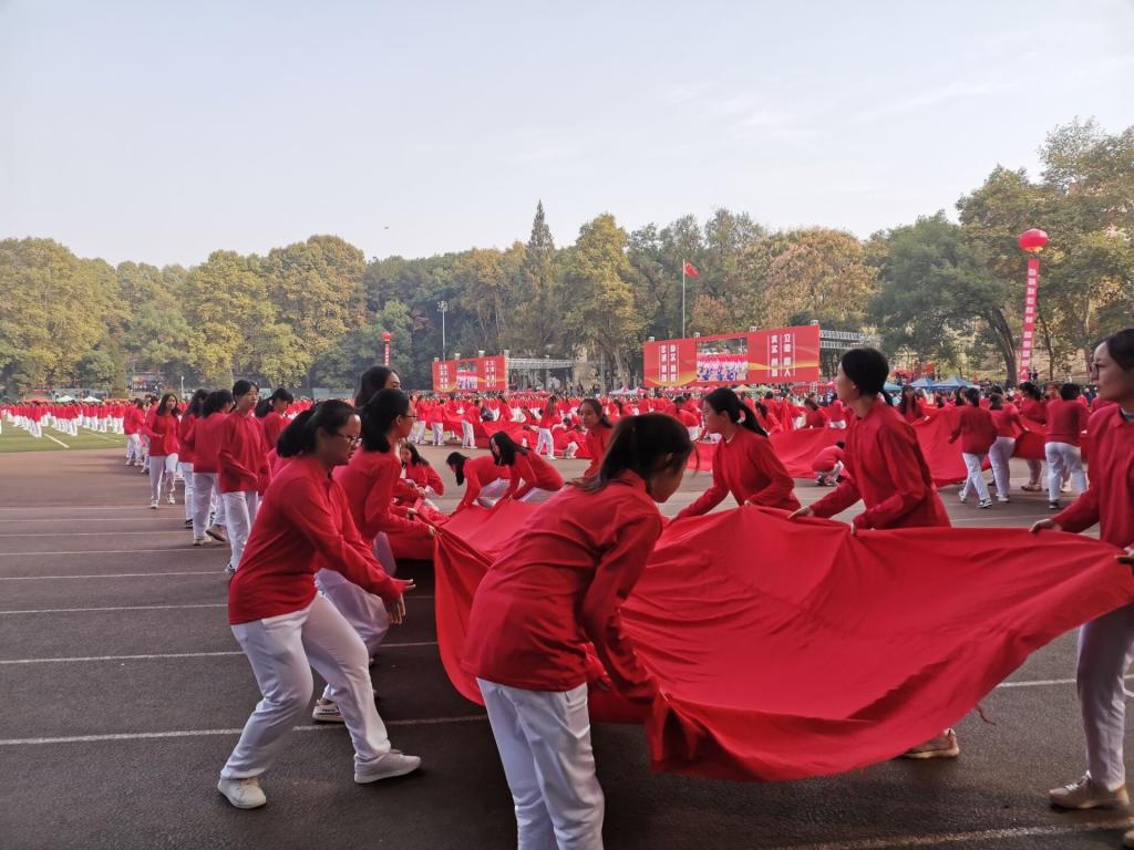 11月7日上午9点30分,华中师范大学2019年度秋季运动会的团体操项目展示于佑铭田径场准时开始,各院同学们都正为即将展开的展示做着准备工作。田径场内充斥着燃烧的活力。