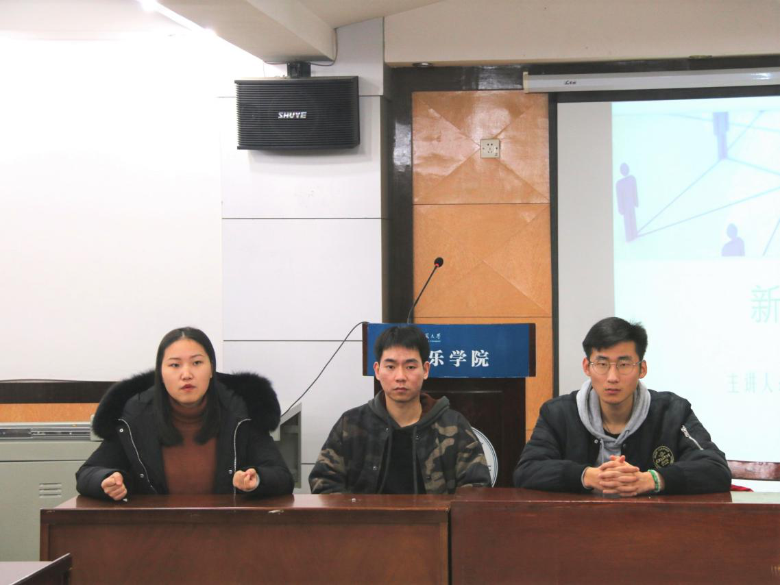 (通讯员:胡艺璇)2018年12月22日下午两点整,音乐学院学术部在华中师范大学音乐学院323教室开展了一次别开生面的新生分享会的活动,本次活动邀请了15级的张可欣、冯望同学和16级的孙麒同学与18级新生围坐在一起,交流自己的学习与生活。张可欣同学多次提到,活动的目的并不是和学弟学妹们分享经验,而是互相交流,相互学习。18级新生踊跃发言,气氛十分热烈。