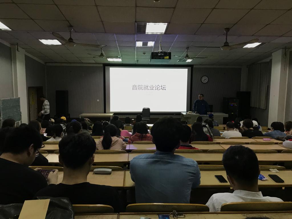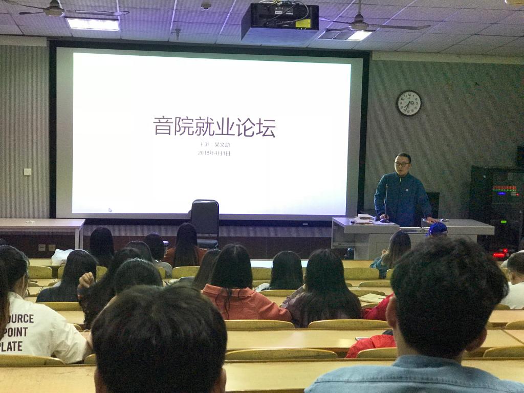 2018年4月1日晚上7点,在音乐学院104大教室,本科2014级同学举行就业论坛。本次邀请吴文劼老师为广大14级本科毕业同学答疑解惑,进行交流,马思明辅导员主持交流活动。