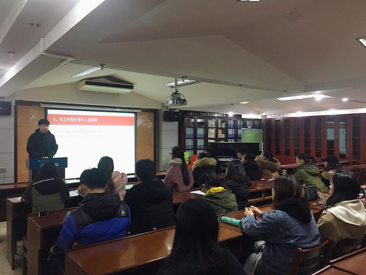 随后团委副副书记冯望上台发言,他充分肯定了这一段时间组织部的工作质量和各年级团日活动开展的情况。他认为只有结合本部门实际制定的具体而又切实可行的工作思路,才能高效的完成团委的任务并调动学生参与活动的积极性。 并指出学院将积极开展向上向善好青年推荐工作。同时,届时会邀请各年级各班代表参与推荐工作,15级和16级各班团支部要做好本学期的入团情况汇总工作。