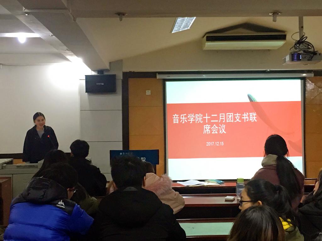 (新闻:程哲 摄影:余芷璇)12月15日晚,华中师范大学音乐学院团委学生会十二月团支书联席会议顺利召开。会议由组织部部长张雨晴,团委副副书记冯望主持,15、16、17级各班团支书和宣传委员参加了本次会议。音乐学院院建立和实施团支书联席会议制度旨在贯彻落实我校第十三次党代会精神以及加强部门之间的沟通、交流与合作,有利于整合资源,形成合力,提高工作效能。